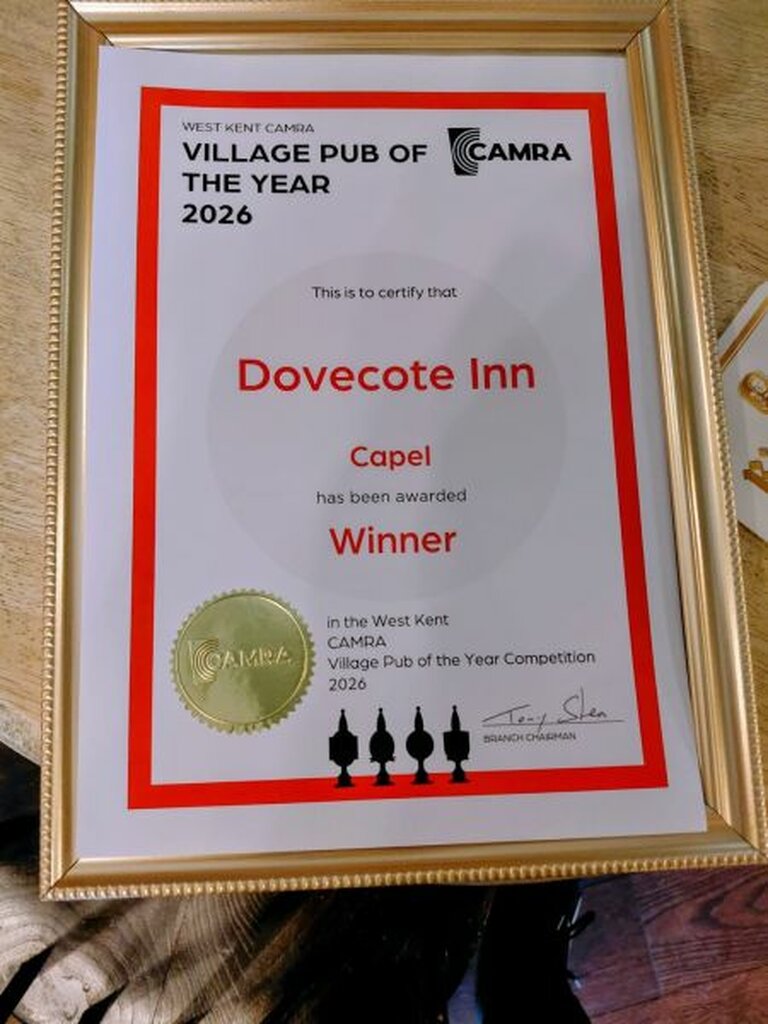 On Thursday 16 April 2026 we visited the Dovecote Inn, Capel to present them with Their Village Pub of the Year 2026. The photo below shows Don Croker, CAMRA presenting the Certificate to Simon, Lindsey and staff.