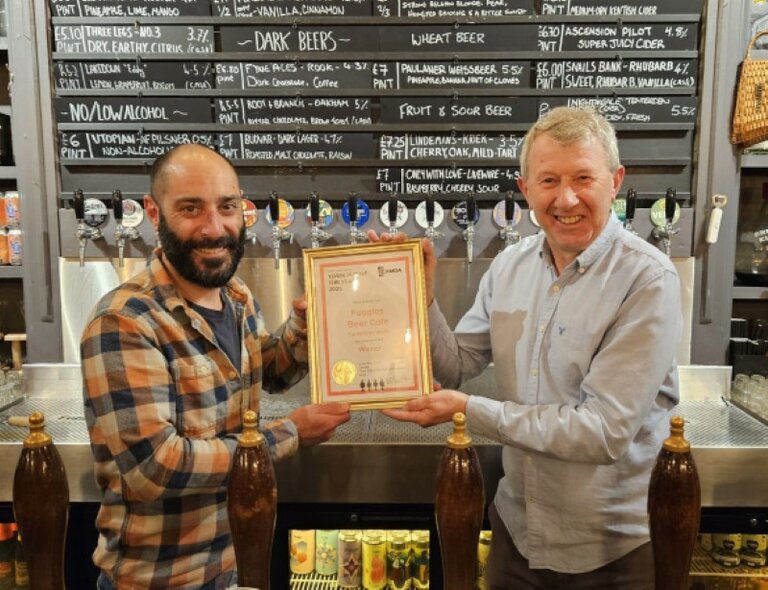 On Wednesday 22 April we gathered at Fuggles Beer Cafe Tunbridge Wells for the Tunbridge Wells Town Pub of the Year presentation. The photo shows Alex Greig (Owner and Beer Guy) receiving his Certificate from Tony Shea (Chair, West Kent CAMRA).